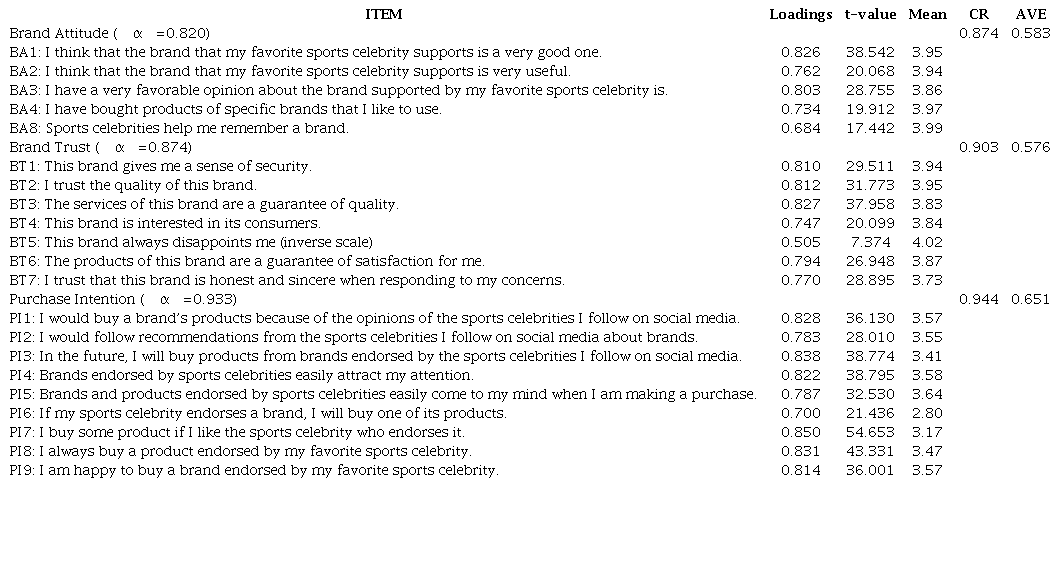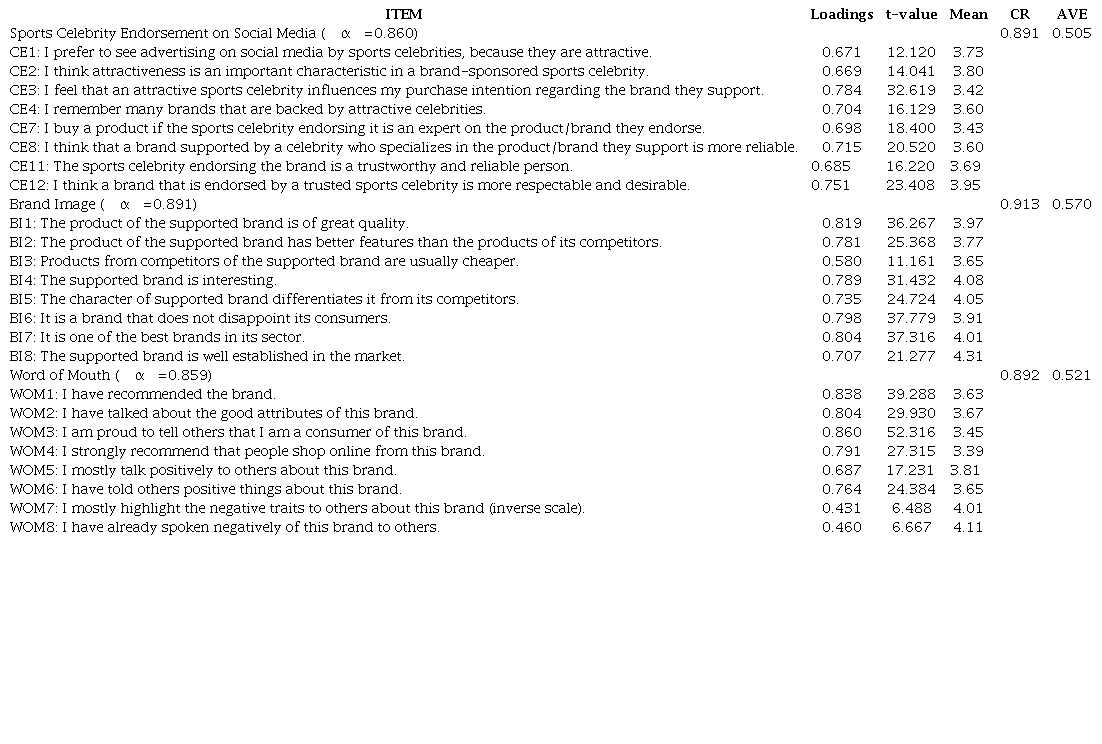Regarding the parameters of the Composite Reliabilities (CR) and the Average Extracted Variances (AVE), the values are also above the ones usually recommended in the existing literature. According to Hair et al. (2010), the minimum recommended values of CR and AVE are 0.7 and 0.5, respectively. However, for the good health of the test and the analysis, 4 items have been removed from the construct “sports celebrity endorsement” on social media (CE5, CE6, CE9, and CE10) and 3 from the brand attitude construct (BA5, BA6, and BA7). This has happened because the AVE values have been previously below 0.5, which was not recommended. By removing these items — which have had loadings below 0.6, and therefore have been less impactful —, the AVE values of these two variables have risen higher than 0.5, which intensifies the viability of the model. Apart from these 7 removed items, all loadings have had values above 0.6. Furthermore, the T-values are all high, which reflects the strong correlation between the items and the constructs, thus validating them.