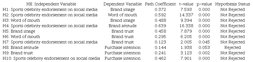 Finally, the positive influence of sports celebrity endorsement via social media on purchase intention has been confirmed, so H10 has been accepted (p<0.01). This assumption is in harmony with the theories proposed by Herjanto et al. (2020) and Febrian and Fadly (2021). This implies that consumers who want to maintain or increase their status are more likely to improve their image by buying brands endorsed by celebrities ( Herjanto et al., 2020).