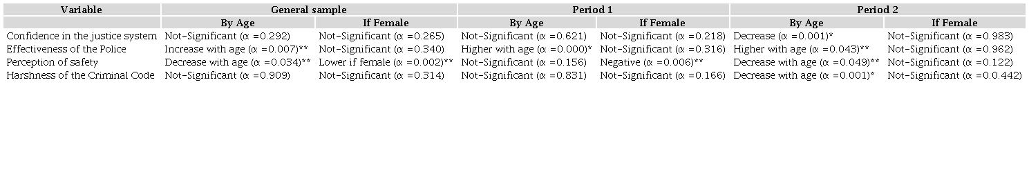 By gender and age, confidence in the courts was not associated with either of these variables (gender and age) in the first period, but there was an association with age in the second period. Confidence in the justice system had significantly fallen in the second period ( =.001). In the case of the effectiveness of the police, opinions were significantly higher by age in the first period ( =0.000), but not by gender ( =0.316), and the same association was seen in the second period. It was significantly higher by age ( =0.043) but not by gender ( =0.962).