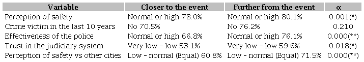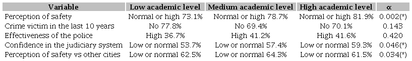 The other significant effect regarded the perception of safety in comparison with other cities. It was significantly higher among those with higher incomes (see table 6). On this point, it must be highlighted that there were no significant differences for the confidence in the judiciary system, where for all economic levels the rating given was very low or low. The same result was obtained when we studied this variable for the educational levels.