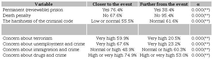 As for the death penalty, there was general disagreement about it in all circumstances, but we must underline that the proportion of people who were against it grew as the social alarm fell. The consensus about the harshness of the criminal code improved as the social alarm decreased. In all cases, the mean differences were significant at 99%. The public’s main concerns (see table 3) appears to decrease in all cases with one exception, that of immigration. In all cases, the mean differences were significant at 99%.