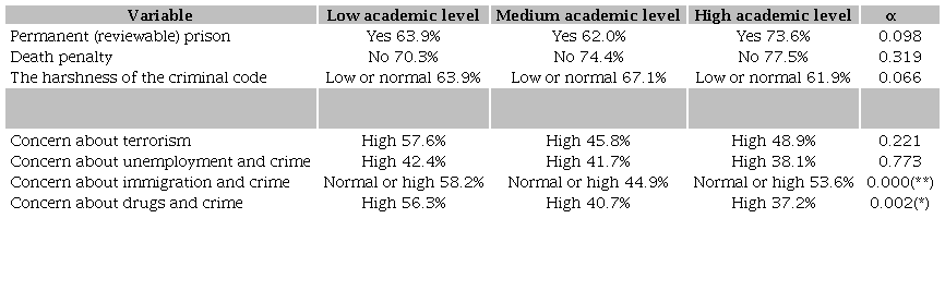 In this case, there were no significant differences for confidence in the judiciary system (in general being mainly low or normal) or for the level of perception of the effectiveness of the police (in general being mainly normal or high). Regarding punishments, general consensus was in favor of permanent (reviewable) prison, and against the death penalty. There were no significant differences in these results among the different educational levels. Similarly, the subjective perception of the harshness of the criminal code did not have any significant differences among educational levels, which was between low and normal (see table 5).
