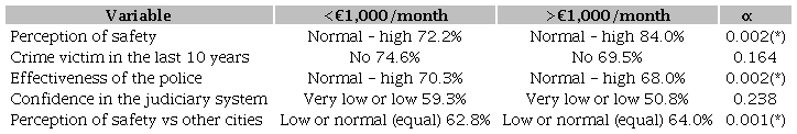 The perception of safety in the city was generally high and the greater the income level, the better the opinion of it was ( =0.002; T=0.134). The valuation of the effectiveness of the police showed statistical differences among each level of the variable, which was higher, the higher the income level was. By dividing the sample into two large groups, the first being below-average and average income earners (€1,000/month) and the other, above-average earners (see table 6), those receiving lower incomes considered the police to have a higher level of effectiveness.
