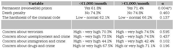 Regarding punishments, the only one for which we found significant effects among income levels was for permanent (reviewable) prison (see table 7). There was a general consensus for this measure, but the proportion of those who supported it was higher among greater-income earners. Again, there was general opposition to the death penalty without any differences among income levels and the perception of the harshness of the Criminal Code was low.