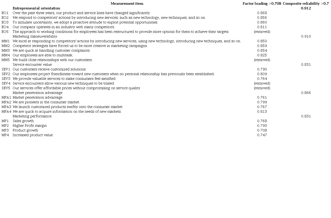 A survey questionnaire was utilized in this study, which included a 10-point semantic differential scale ranging from 'strongly disagree' to 'strongly agree'. The items were adapted from previous literature on EO, MM, strategic entrepreneurial orientation (SEO), MPA, and marketing performance (MP). The measurement of EO was based on five items adapted from ( Rwehumbiza & Marinov, 2020) and ( Sok et al., 2017), which assessed innovativeness, proactiveness, risk-taking, competitive aggressiveness, and firm autonomy. MM was calculated with five items adapted from various sources ( Abdelilah et al., 2018; Chahal et al., 2019; Geyi et al., 2020). MM is a variable that measures a company's response to competitors' strategies, their attitude toward competition, their speed in handling complaints, their operational flexibility, and their network collaboration. SEV was analyzed with five items adapted from ( Ali et al., 2022; Boaventura et al., 2018). SEV measures the functional, emotional, social, epistemic, and economic value of a company's products and services MPA was assessed with four items adapted from ( Nuryakin & Ardyan, 2018). The concept of MPA encompasses several factors, including first-mover advantage, the speed of product launches, information acquisition, and new demand creation. Finally, MP was evaluated with five items adapted from ( Salah & Ayyash, 2024). These items included company performance in terms of sales growth, profit margins, products and services, product value, and market coverage. Items could be removed when they did not meet the criteria during model evaluation. However, since the relationship between constructs and indicators in this research was reflective, the removal of some indicators was not a significant issue. However, the remaining indicators were able to describe the constructs effectively ( Sarstedt et al., 2019). Table 1 presents the measurement items used in this study.