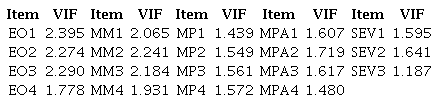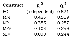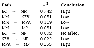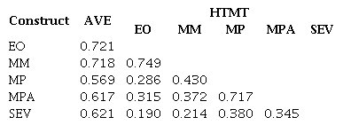 The inner model analysis commenced with an examination of loading indicators and construct reliability, detailed in Table 1. Adhering to established thresholds, successful indicators require loadings greater than 0.708, while acceptable levels for composite reliability should be above 0.7 ( Hair et al., 2022). In this analysis, items EO5, MM5, SEV4, and SEV5 were removed from the model, since they failed to meet the loading indicator criteria. Nevertheless, all constructs successfully met the criteria for composite reliability, indicating overall fit in these aspects of the model.