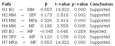 The findings indicate strong relationships among constructs, with several hypotheses being supported, and one key relationship notably mediated. A strong and positive relationship was established between EO and MM (Hypothesis 1, = 0.653, p < 0.001, t-value = 14.822), demonstrating that an increase in EO significantly enhanced MM. The influence of MM on SEV (Hypothesis 2, = 0.173, p = 0.002, t-value = 2.818) and MPA (Hypothesis 3, = 0.326, p < 0.001, t-value = 5.914) was also supported, underscoring MM's role in enhancing both SEV and MPA. MM's direct impact on MP was also significant (Hypothesis 4, = 0.186, p = 0.005, t-value = 2.558), as was the relationship between SEV and MP (Hypothesis 6, = 0.120, p = 0.016, t-value = 2.138), and between MPA and MP (Hypothesis 7, = 0.653, p < 0.001, t-value = 14.822). However, the direct influence of EO on MP was not supported (Hypothesis 5, = -0.045, p = 0.259, t-value = 0.645), suggesting that EO alone did not significantly affect MP. Crucially, a mediation analysis revealed that MM fully mediated the relationship between EO and MP ( = 0.121, p < 0.01, t-value = 2.496). This finding indicates that the impact of EO on MP occurred with MM, illustrating MM's critical role in leveraging EO to enhance MP.