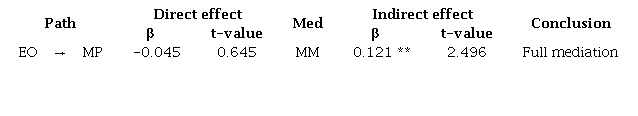 In this study, mediation analysis was utilized to explore the mechanisms underlying the influence of EO on MP. Although the direct relationship posited in Hypothesis 5 (EO MP) was not supported, subsequent mediation testing revealed that MM served as a full mediator in this relationship. This mediation effect is detailed in Table 7, which demonstrates that EO did not directly affect MP but indirectly did with MM, highlighting the full mediation effect where the presence of MM accounted for the entire relationship between EO and MP.