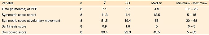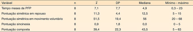A média de tempo de PFP foi de 7,1 meses (DP=7,7), mediana de 4,9, variando entre menor de 1 mês a 23 meses. Em relação à pontuação composta da avaliação da função facial, a média de pontos foi de 39,4 (DP=22,3), mediana 43,5 pontos, valor mínimo de 5 e máximo de 63 pontos (Tabela 2).