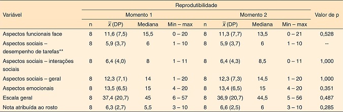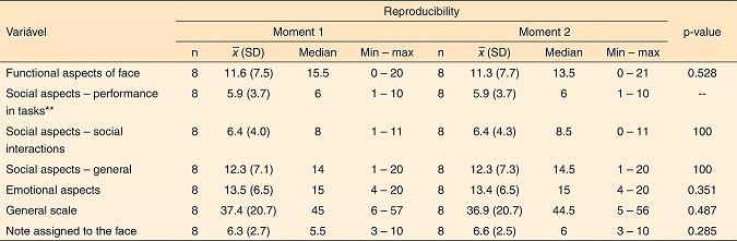 A análise de reprodutibilidade entre o primeiro e segundo momento do estudo piloto mostrou que o questionário foi fidedigno para todas as escalas analisadas: Aspectos Funcionais da Face (p=0,528), Aspectos Sociais (p=1,000), Aspectos Emocionais (p=0,351), Geral (p=0,487) e Nota atribuída ao rosto (p=0,285) (Tabela 3).