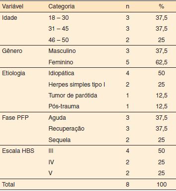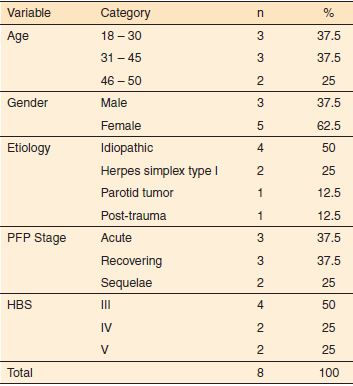 Dos sujeitos pesquisados, 62,5% tiveram a hemiface direita afetada. Quanto à etiologia, 50% dos sujeitos tiveram a etiologia idiopática, 25%, herpes simples tipo I e 12,5%, tumor de parótida e pós-trauma.