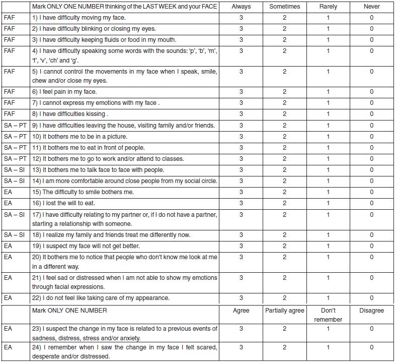 Conclusion: This study provided subsides for the improvement and final elaboration of an instrument that aims to investigate the psychosocial aspects associated with peripheral facial palsy.