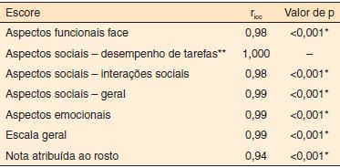 Resultados: A verificação da aplicabilidade aumentou a familiaridade com o processo de coleta de dados e auxiliou nas modificações dos procedimentos. O questionário mostrou-se fidedigno para todas as escalas analisadas: Aspectos Funcionais da Face, Aspectos Sociais, Aspectos Emocionais, Geral e Nota atribuída ao rosto. O coeficiente de correlação intraclasse (ricc) demonstrou a reprodutibilidade do instrumento, tendo apresentado, neste caso, valores excelentes para todas os grupos temáticos analisados.