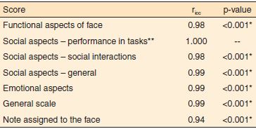 Results: Assessing the applicability increased the familiarity with the data collection process and contributed to modifications in the procedures. The questionnaire proved to be reliable for all the scales analyzed: Functional, Social, and Emotional Aspects of Face, General, and Note Assigned to the Face. The intraclass correlation coefficient (ricc) demonstrated the reproducibility of the instrument by showing excellent values for all thematic groups analyzed.