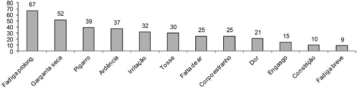 O relato de elevado número de sintomas proprioceptivos pela maioria da população estudada confirma outras pesquisas realizadas com professores(5,6,7,8,9,12,20,21). Os sintomas mais frequentes observados no presente estudo se assemelham aos verificados em outra análise, com 110 professoras do município de Maceió (AL), que foram: garganta seca (54,5%), pigarro (42,7%) e ardor na garganta (42,7%)(21). Chama atenção o fato de que a prevalência de sintomas foi maior no estudo citado: os sintomas vocais mais relatados por 82 professoras universitárias foram: pigarro (47%), tosse (66%) e garganta seca (60%)(9).