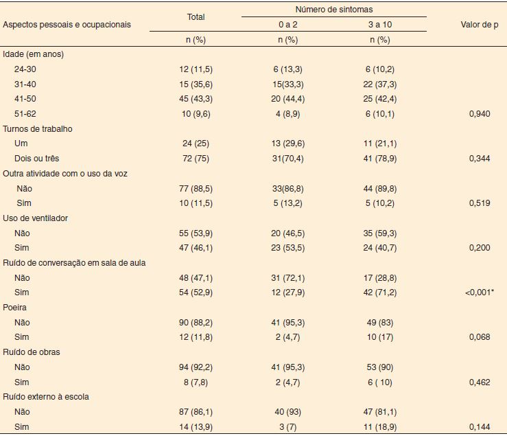 As professoras que mais mencionaram a presença de poeira, ruído de obras, ruído externo à escola e conversação na sala de aula foram aquelas que perceberam três ou mais sintomas vocais. Na análise estatística, os grupos se diferenciaram apenas na associação do número de sintomas com a presença de conversação na sala de aula. Os dados relativos aos aspectos pessoais e ocupacionais das professoras em terapia de voz são apresentados na Tabela 1.