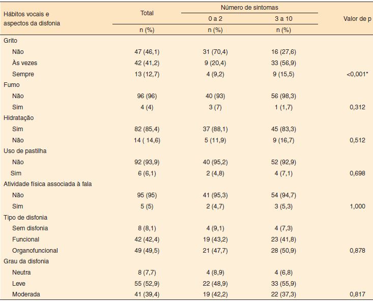 O diagnóstico fonoaudiológico das disfonias foi funcional ou organofuncional e não foi verificada a presença de disfonia em grau intenso. Chamou atenção o fato de 7,7% das professoras com voz neutra terem realizado fonoterapia. Os grupos se distinguiram na associação entre o número de sintomas e o hábito de gritar. Os hábitos relacionados à voz e aspectos clínicos da disfonia na população estudada estão descritos na Tabela 2.