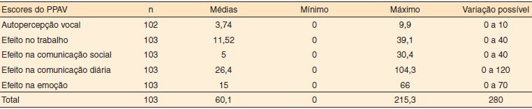 Os escores médios do PPAV encontrados neste estudo indicam que a qualidade de vida da população estudada é pouco afetada por suas vozes, em concordância com achados de outra pesquisa(4), que utilizou o mesmo protocolo. Os parâmetros de qualidade de vida mais acometidos pela disfonia foram o trabalho, a emoção e a comunicação diária, respectivamente. Os valores médios obtidos foram baixos, em relação à pontuação máxima do teste para cada parâmetro, porém, ultrapassam o esperado para vozes saudáveis(18). Observou-se que houve grande variação em todos os parâmetros, quanto aos escores mínimos e máximos. Este achado confirma que, apesar do grupo estudado ser homogêneo quanto à ocupação e características vocais, nem todas as professoras apresentaram limitações nas atividades habituais por causa do problema de voz.