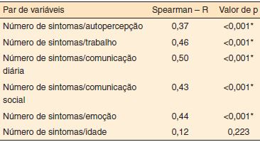 O número de sintomas vocais relatados pelas professoras foi positivamente correlacionado com todos os parâmetros avaliados pelo PPAV. Não houve correlação entre o número de sintomas e a idade da população estudada (Tabela 4).