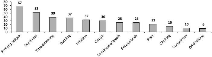 Os sintomas vocais investigados foram os proprioceptivos, ou seja, aqueles que se referem às sensações que o indivíduo experimenta quando produz a voz. Esses foram caracterizados pelo relato de tosse, garganta seca, pigarro, ardência, engasgo, falta de ar, corpo estranho, fadiga por uso prolongado e/ou por uso breve da voz, irritação, constrição laríngea e dor, ao falar. Não foram incluídas, neste estudo, as avaliações de sintomas vocais auditivos.