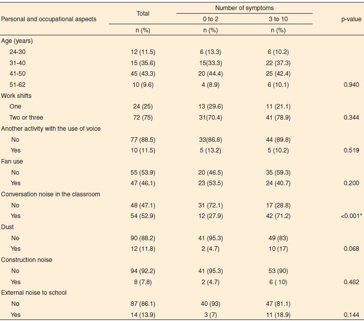 As professoras que mais mencionaram a presença de poeira, ruído de obras, ruído externo à escola e conversação na sala de aula foram aquelas que perceberam três ou mais sintomas vocais. Na análise estatística, os grupos se diferenciaram apenas na associação do número de sintomas com a presença de conversação na sala de aula. Os dados relativos aos aspectos pessoais e ocupacionais das professoras em terapia de voz são apresentados na Tabela 1.