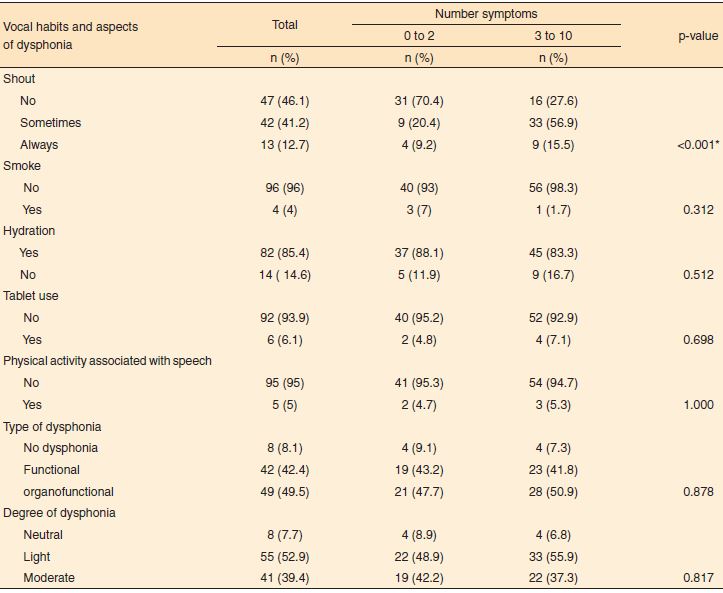O diagnóstico fonoaudiológico das disfonias foi funcional ou organofuncional e não foi verificada a presença de disfonia em grau intenso. Chamou atenção o fato de 7,7% das professoras com voz neutra terem realizado fonoterapia. Os grupos se distinguiram na associação entre o número de sintomas e o hábito de gritar. Os hábitos relacionados à voz e aspectos clínicos da disfonia na população estudada estão descritos na Tabela 2.