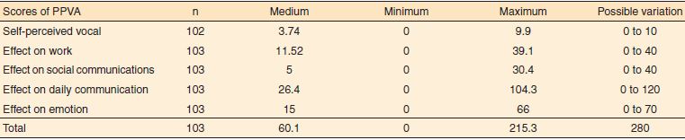 Os escores médios do PPAV encontrados neste estudo indicam que a qualidade de vida da população estudada é pouco afetada por suas vozes, em concordância com achados de outra pesquisa(4), que utilizou o mesmo protocolo. Os parâmetros de qualidade de vida mais acometidos pela disfonia foram o trabalho, a emoção e a comunicação diária, respectivamente. Os valores médios obtidos foram baixos, em relação à pontuação máxima do teste para cada parâmetro, porém, ultrapassam o esperado para vozes saudáveis(18). Observou-se que houve grande variação em todos os parâmetros, quanto aos escores mínimos e máximos. Este achado confirma que, apesar do grupo estudado ser homogêneo quanto à ocupação e características vocais, nem todas as professoras apresentaram limitações nas atividades habituais por causa do problema de voz.