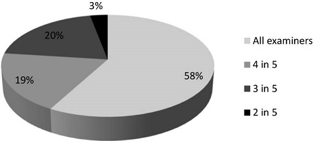 Em análise da quantidade de respostas iguais para uma mesma amostra, observou-se que, em 58% delas (45/78), os 5 examinadores obtiveram 100% de concordância. Quatro concordaram em 19% das amostras (15/78), 3 concordaram em 20% (16/78) e, em 3% (2/78), houve concordância de apenas 2 dos 5 examinadores (Figura 1).