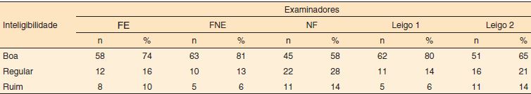 O cálculo da proporção de respostas para cada classificação de inteligibilidade, de acordo com cada um dos cinco examinadores, revelou que o FE classificou 58 amostras (74%) como inteligibilidade boa, 12 (15%) como regular e 8 (10%) como ruim. O FNE classificou 63 amostras (81%) como inteligibilidade boa, 10 (13%) como regular e 5 (6%) como ruim. O profissional NF classificou 45 amostras (58%) como inteligibilidade boa, 22 (28%) como regular e 11 (14%) como ruim. O Leigo 1 classificou 62 amostras (79%), como inteligibilidade boa, 11 (14%) como regular e 5 (6%) como ruim. Por fim, o Leigo 2 classificou 51 amostras (65%) como inteligibilidade boa, 16 (21%) como regular e 11 (14%) como ruim. Desta forma, a proporção de casos considerados com boa inteligibilidade variou de 58% a 81%. Para os casos ruins, essa variação foi de 6% a 14% (Tabela 1).