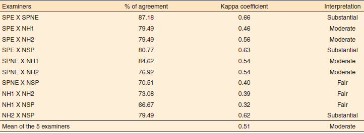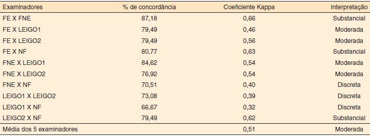 Assim, a concordância entre os examinadores, obtida por meio do coeficiente de Kappa, variou de discreta a substancial (0,32 a 0,66), com concordância média indicativa de moderada (0,51). A melhor concordância obtida, substancial (0,66), ocorreu entre FE e FNE e a pior concordância, discreta (0,32), foi observada entre o Leigo 1 e NF (Tabela 2).