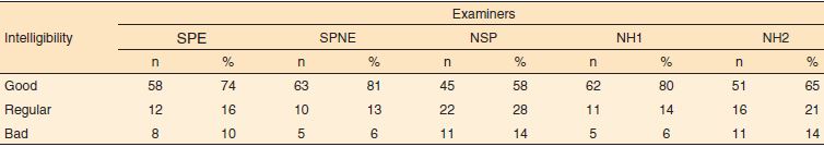 Conclusion: The present outcomes evidenced adequate speech intelligibility after primary palatoplasty in the majority of cases, suggesting that these individuals are well understood in their social environment. The examiner experience presented to be an important variable in the analysis.
