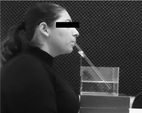 Os sujeitos do GFTVIA foram instruídos a colocar a extremidade proximal do tubo (de vidro, 27 cm de comprimento, 1mm de espessura e 9 mm de diâmetro)(5,10,12,20,21) entre os lábios e a emitir o fonema /u:/, cuidando para manter o selamento dos lábios para evitar escape de ar entre os lábios e o tubo.