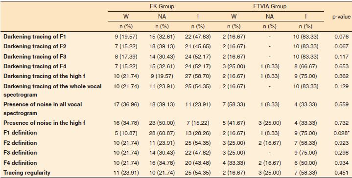 Em relação aos resultados da pesquisa, houve maior definição de F1 no GFTVIA (Tabela 1). Como os F estão relacionados mais diretamente ao filtro vocal, esse resultado sugere que a FTVIA provoca mais modificações nessa região, quando comparada com a técnica de FK. A literatura mostra que o F1 está relacionado à abertura da boca e à altura da língua na cavidade oral e, de modo geral, os formantes são regiões de incremento da amplitude de determinados grupos de harmônicos, associando-se à ressonância vocal(21,23).