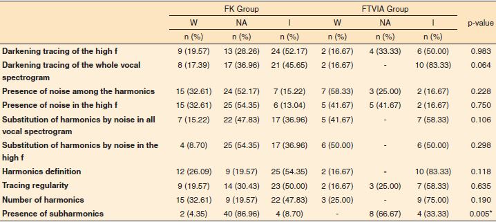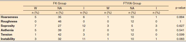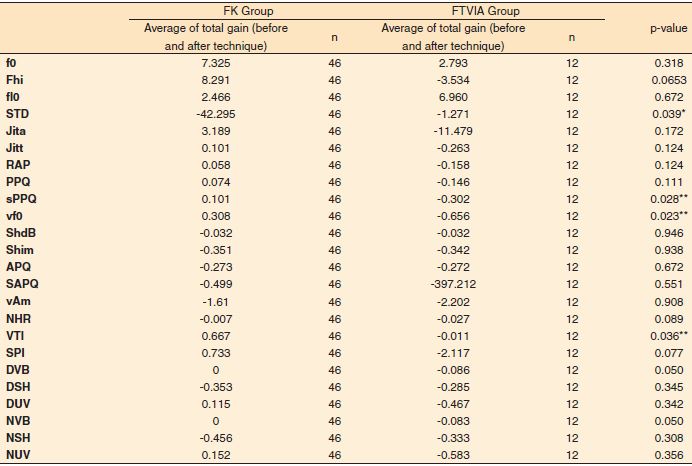 Um trabalho(20) com o FK mostrou diminuição percentual da instabilidade vocal, imediatamente após a técnica, mantendo o resultado após cinco minutos de repouso, sugerindo que o FK gera maior estabilidade. Neste estudo, um grupo não mostrou maiores melhoras perceptivo-auditivas do que o outro (Tabela 3), possivelmente devido a ambas as técnicas serem ETVSO, que melhoram a vibração das pregas vocais, proporcionando maior periodicidade e estabilidade, com diminuição de energia aperiódica(1,2,9,10,20).