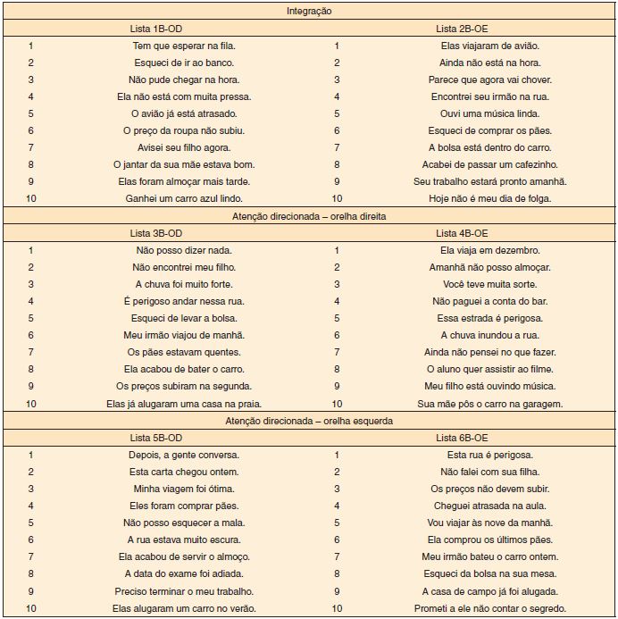 Considerando a importância das informações sobre o processamento auditivo fornecido pelos testes dicóticos, surgiu o interesse em propor um teste que também utilizasse frases como estímulo, usando as sentenças a partir do teste Listas de Sentenças em Português ( 6) (LSP-BR), desenvolvido na língua portuguesa do Brasil, contendo sentenças com sentido, como estímulo de fala. Constituído de uma lista com 25 sentenças e sete listas com dez sentenças, este material se aproxima mais das características de uma situação comunicativa, do que palavras isoladas.