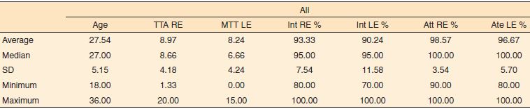 Apesar do objetivo deste estudo não ter sido estabelecer parâmetros, ao analisar os resultados encontrados na tarefa de integração, na qual as duas frases ouvidas deveriam ser repetidas, foi verificado um desempenho levemente inferior da orelha esquerda (90,24%), se comparado à orelha direita (93,33%), fenômeno semelhante encontrado em outros estudos ( 25, 26, 27, 28) . Na tarefa de separação binaural, os resultados na atenção à direita e à esquerda (98,57% e 96,67%, respectivamente) também foram levemente inferiores na orelha esquerda, levando-se em conta a média dos resultados encontrados. Entretanto, ao considerar os resultados das medianas, o desempenho dos indivíduos na tarefa de integração binaural foi o mesmo, tanto na orelha direita quanto na orelha esquerda (95%). Já na separação binaural, foi de 100% de acertos.