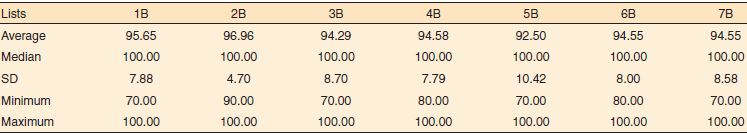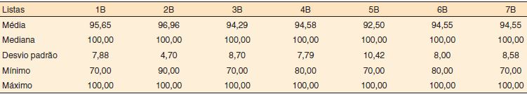 A média, mediana, desvio padrão, mínimo e máximo das pontuações obtidas com as diferentes listas estão dispostos na Tabela 3.