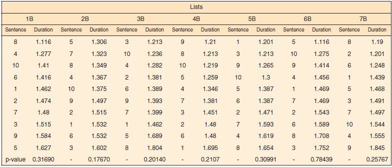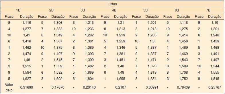 A fim de evitar que uma das sentenças de cada par de frases fosse mais longa, a ponto de uma delas continuar após o término da outra, as frases de cada lista foram combinadas em ordem crescente de duração. Em todas as combinações realizadas, foi verificado que a maior diferença encontrada entre a duração das frases foi de 243 milissegundos, entre as sentenças “Hoje não é meu dia de folga”, da lista 2B e “Deixei as folhas em cima da mesa”, da lista 7B, o que não foi considerado significativo, uma vez que o tempo médio de duração de uma sílaba é de 200 a 300 milissegundos ( 11) , não interferindo, assim, na resposta do sujeito avaliado. Deste modo, as sete listas possuíam sentenças com tempos de duração equivalentes ( Tabela 1), pois não houve diferença significativa entre elas.