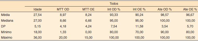 Os dados correspondentes à média, mediana, desvio padrão, mínimo e máximo da idade, médias tritonais e aplicação do teste LSP dicótico, estão expostos na Tabela 2.