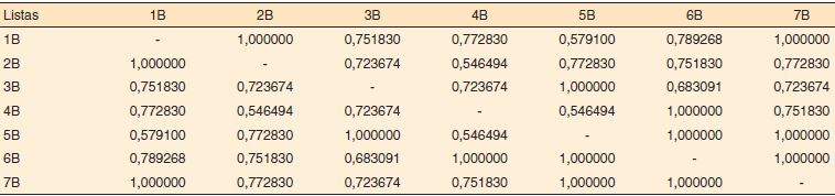 Ao agrupar as porcentagens de acertos das diferentes listas, obtidas nas três situações de aplicação ( Tabela 3), foi verificado que as sete listas apresentaram respostas semelhantes entre si, pois, ao compará-las ( Tabela 4), não foi evidenciada diferença significativa. Estes resultados demonstram que as listas possuem comportamento semelhante e que, portanto, qualquer uma delas pode ser aplicada, desde que mantenham a ordem de apresentação das frases e as combinações sugeridas, sem o risco de haver influência da lista utilizada.