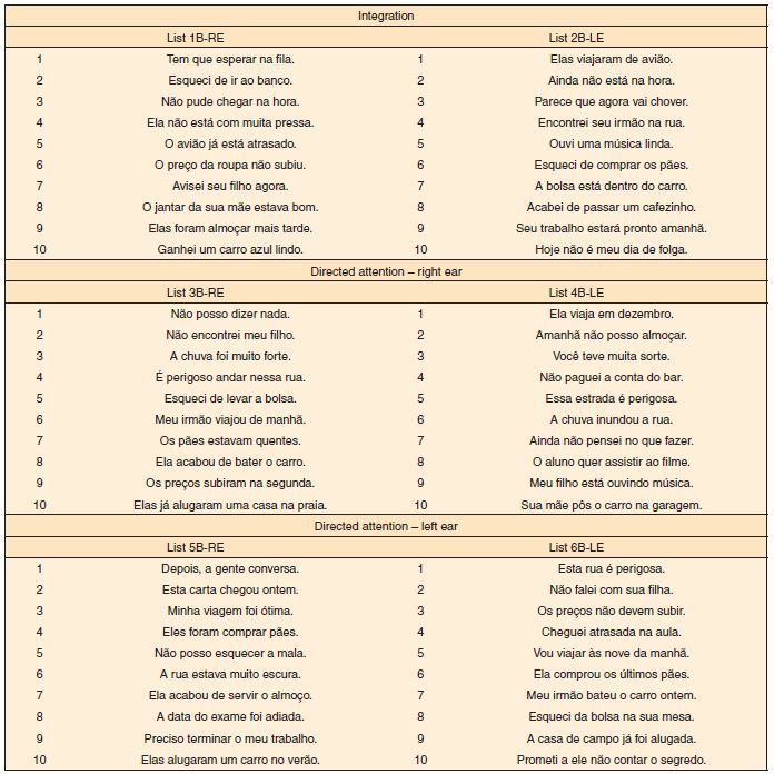 Conclusion: The Brazilian Portuguese Dichotic Sentence List Test was developed and proved to be an instrument that can be used in adults. Therefore, a protocol was proposed with two different combinations of lists and presentation sequence for auditory processing assessment.