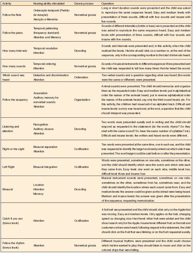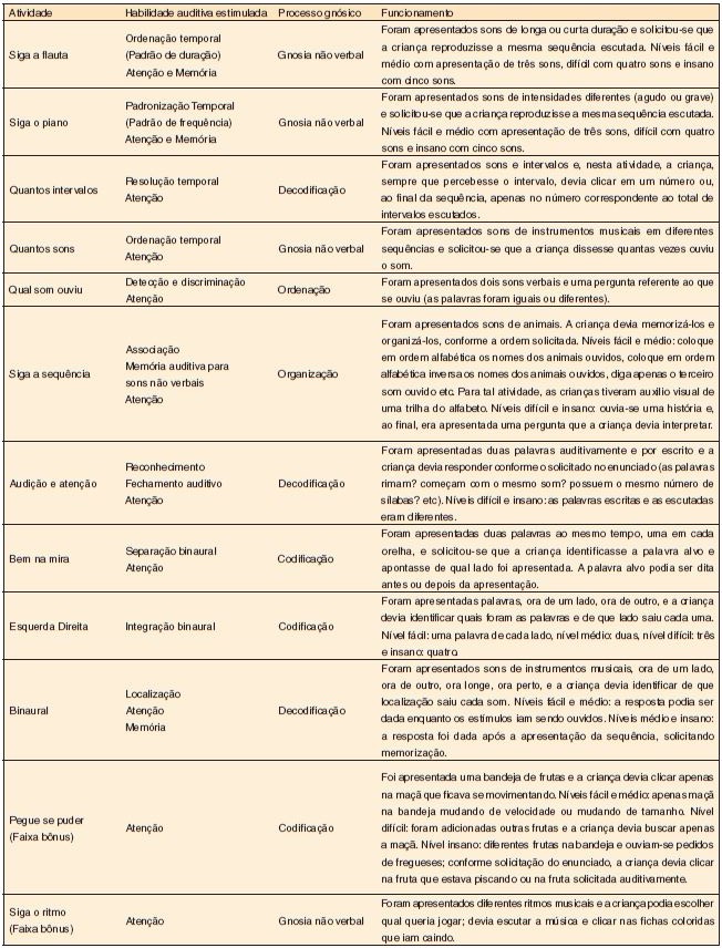 Todas as atividades possuíam quatro níveis de dificuldade: fácil, médio, difícil e insano. No último nível, ainda houve presença de ruído competitivo. Possuíam, também, um tempo limite para que as crianças fornecessem a resposta à atividade proposta, contudo, neste estudo, esse tempo não foi considerado. Assim, utilizou-se a possibilidade de “pausa” para permitir maior tempo de raciocínio às crianças.