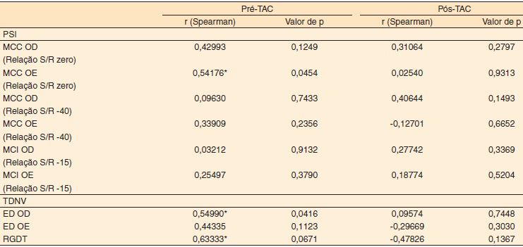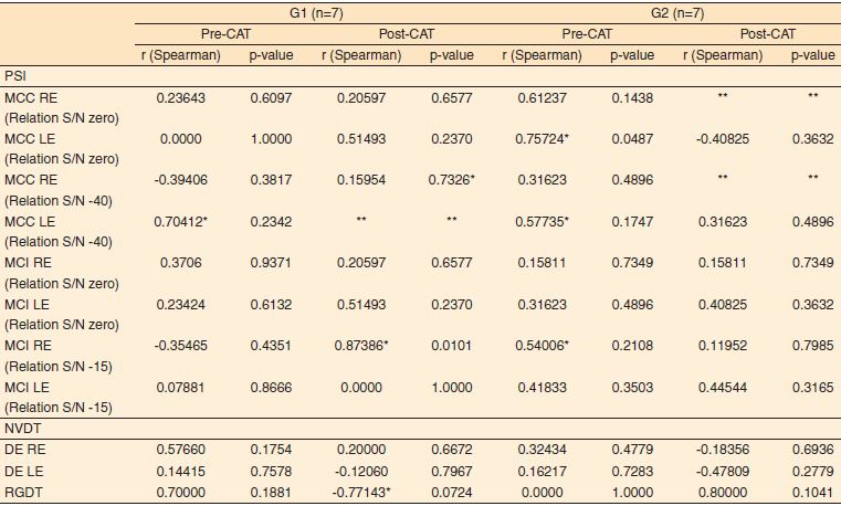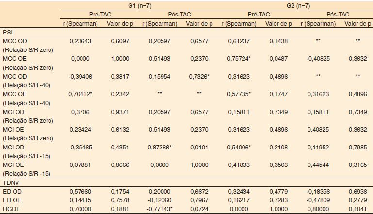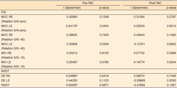 Desta forma, observou-se que no G1 houve relação positiva forte na etapa de MCI na orelha direita (relação −15 dB) pós-TAC e moderada na etapa MCC na orelha esquerda (relação −40 dB) e RGDT pré-TAC. Observou-se, também, correlação negativa moderada no teste RGDT pós-TAC. Quanto ao G2, obteve-se forte correlação na etapa MCC na orelha esquerda (relação zero) e moderada na etapa MCC na orelha direita (relação zero), MCC orelha esquerda (relação −40 dB) e MCI orelha direita (relação −15 dB).