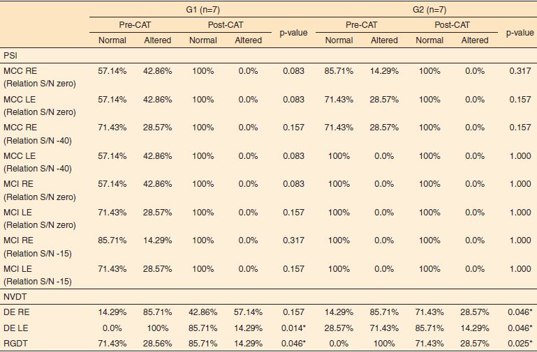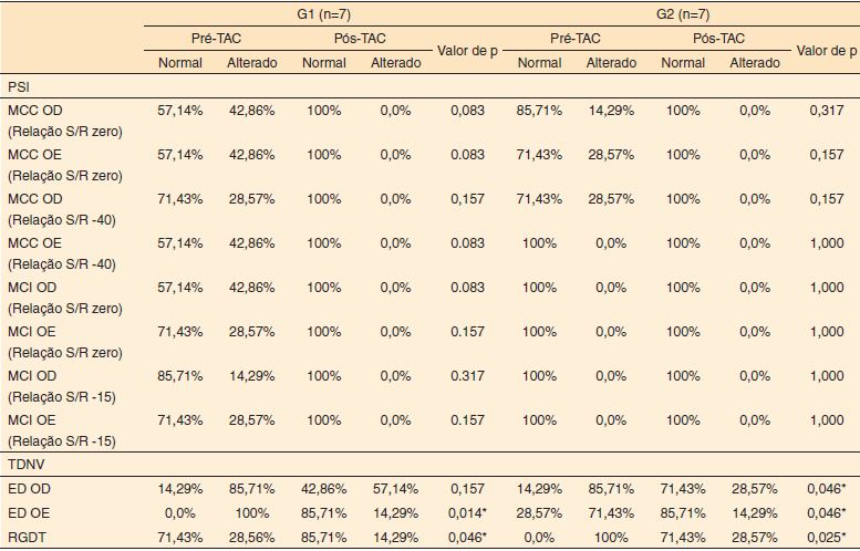 A análise descritiva e o estudo estatístico, considerando o desempenho nos testes comportamentais selecionados (normal ou alterado), em ambos os grupos, pré-TAC e pós-TAC, mostraram resultado significativo no teste RGDT (p=0,045 G1 e 0,025 G2) e TDNV etapa de escuta direcionada à esquerda (p=0,014 G1 e 0,046 G2) nos dois grupos e à direita apenas no grupo G2 (p=0,046) (Tabela 1).