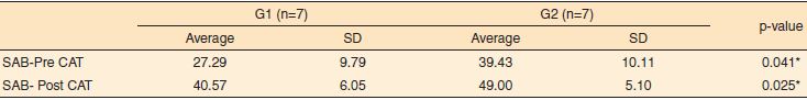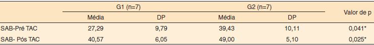 Com relação à Escala SAB, utilizada também para a mensuração do efeito da intervenção terapêutica proposta, realizou-se a pesquisa dos escores pré-TAC e pós-TAC, comparando-os entre os grupos (Tabela 2).