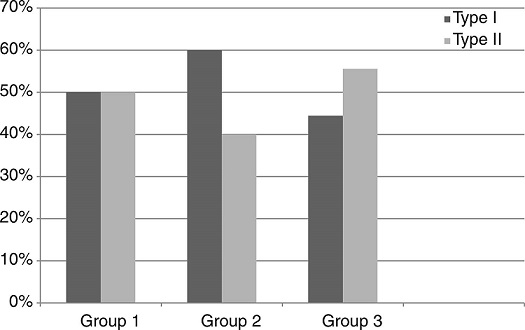 O movimento lento dos olhos de perseguição foi estudado por meio do rastreio pendular. Nenhum dos participantes apresentou rastreio do tipo III ou IV. Foi observada apenas a presença de rastreios do tipo I e II, sendo que a distribuição destes se deu de maneira igualitária no grupo 1. No grupo 2, foi possível verificar maior incidência de rastreio do tipo I (60%) e no grupo 3, observou-se predomínio do rastreio de tipo II (55,5%) (Figura 1).
