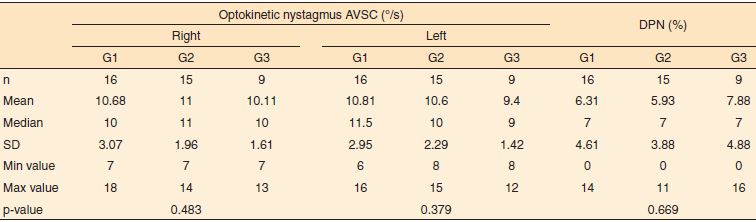 Na prova do nistagmo optocinético (Tabela 1) não foi encontrada diferença para os valores de VACL dos nistagmos para a direita, para a esquerda e a PDN, quando comparados os três grupos etários. Verificou-se que a preponderância direcional do nistagmo foi de 16%. Esses resultados eram esperados, visto que indivíduos sem alterações apresentam simetria dos resultados e PDN até 16%(16). Estudo anterior realizado com indivíduos sem alterações, também encontrou simetria na prova de nistagmo optocinético(4).
