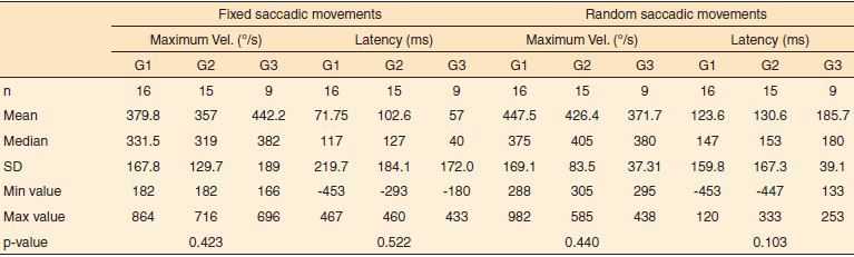 Quanto aos movimentos sacádicos fixos e aleatórios, foram estudadas a velocidade máxima (°/s) e latência (ms) para cada grupo, assim como a comparação entre os grupos. O teste estatístico da Kruskal-Wallis não revelou diferença entre os grupos (Tabela 2)