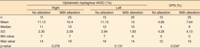 Quando realizada a análise dos movimentos optocinéticos nos grupos com e sem alteração visual, pôde-se perceber que a VACL não apresentou diferença entre os grupos, ou seja, a alteração visual não interferiu no movimento. Porém, quando analisada a PDN entre os grupos, observou-se que foi maior no grupo com alteração, ou seja, pessoas com presença de alteração visual revelaram menor simetria do que pessoas sem alterações visuais.