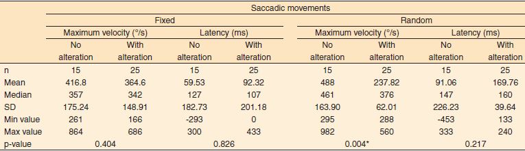 Quanto aos movimentos sacádicos fixos em indivíduos com e sem alteração visual, não foi encontrada diferença em relação à velocidade máxima ou à latência dos movimentos. Já nos movimentos sacádicos aleatórios, verificou-se que a velocidade máxima foi maior em indivíduos que não possuíam alteração visual (p=0,004).